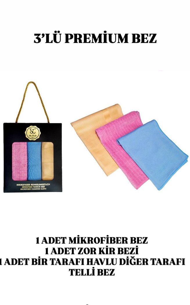 1 adet mikrofiber bez, 1 adet zor kir bezi ve 1 adet bir tarafı havlu diğer tarafı telli bez içeren 3'lü premium temizlik bezi seti.