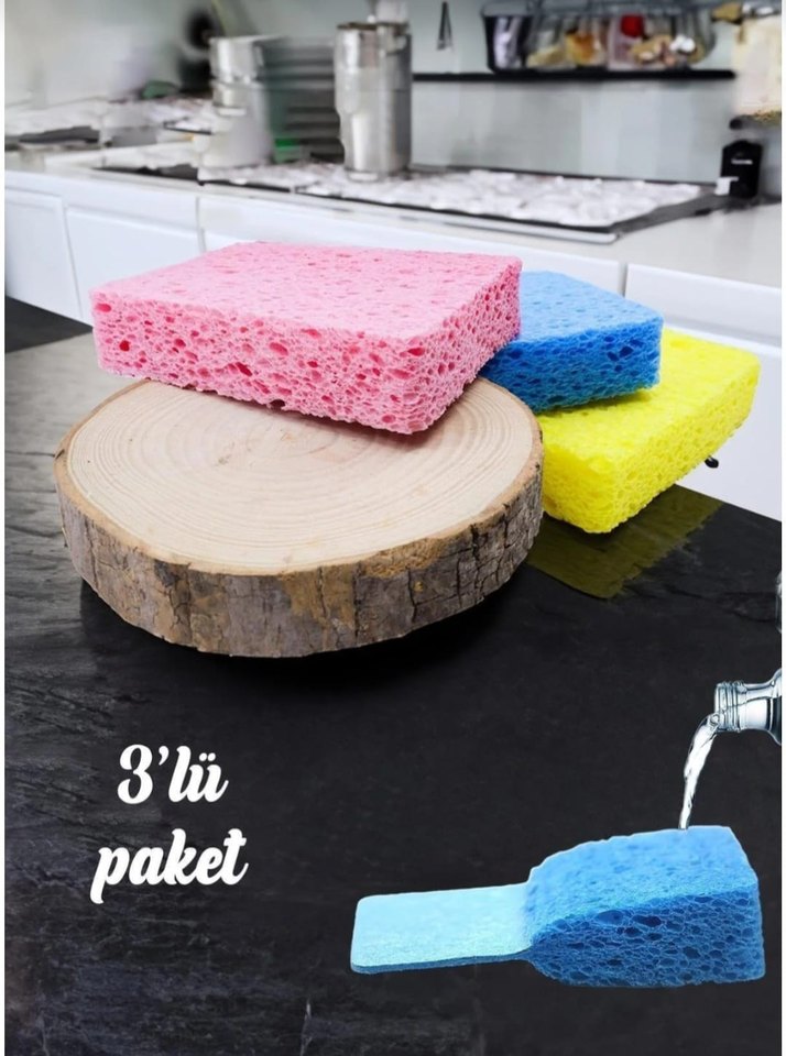Pembe, mavi ve sarı olmak üzere 3 adet renkli, yumuşak ve gözenekli banyo süngeri paketi. Temizleme için uygundur.