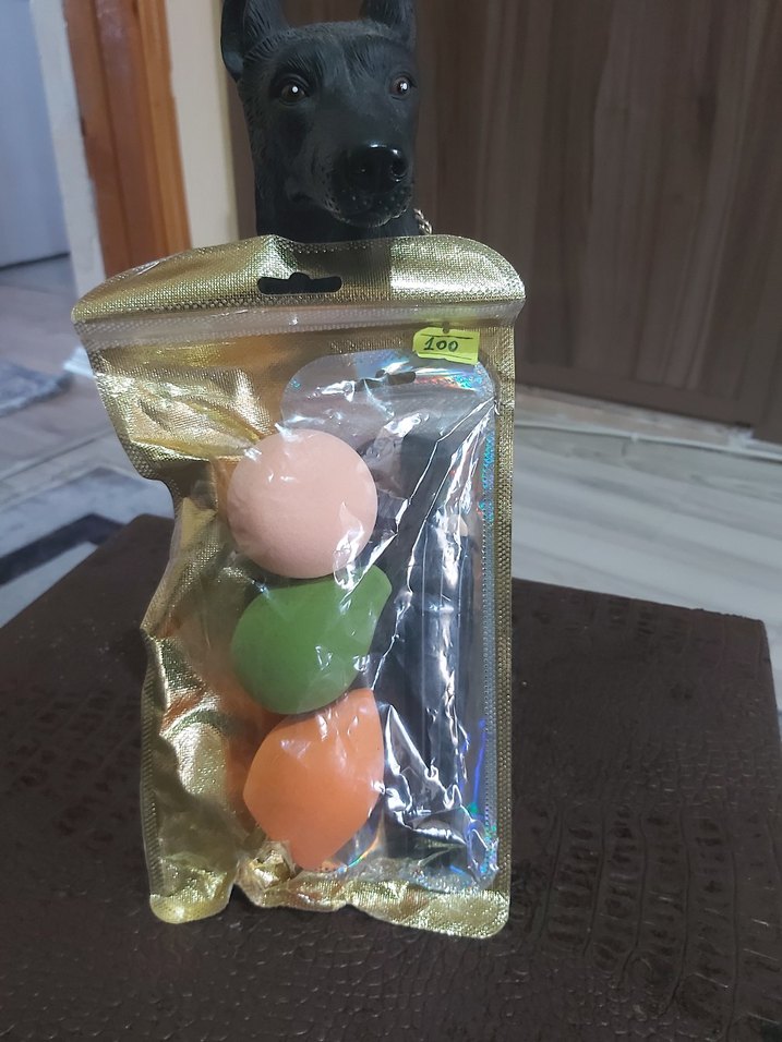 Khaki, koyu yeşil ve şeftali renklerinde 3'lü makyaj süngeri seti, pürüzsüz uygulama için uygun.