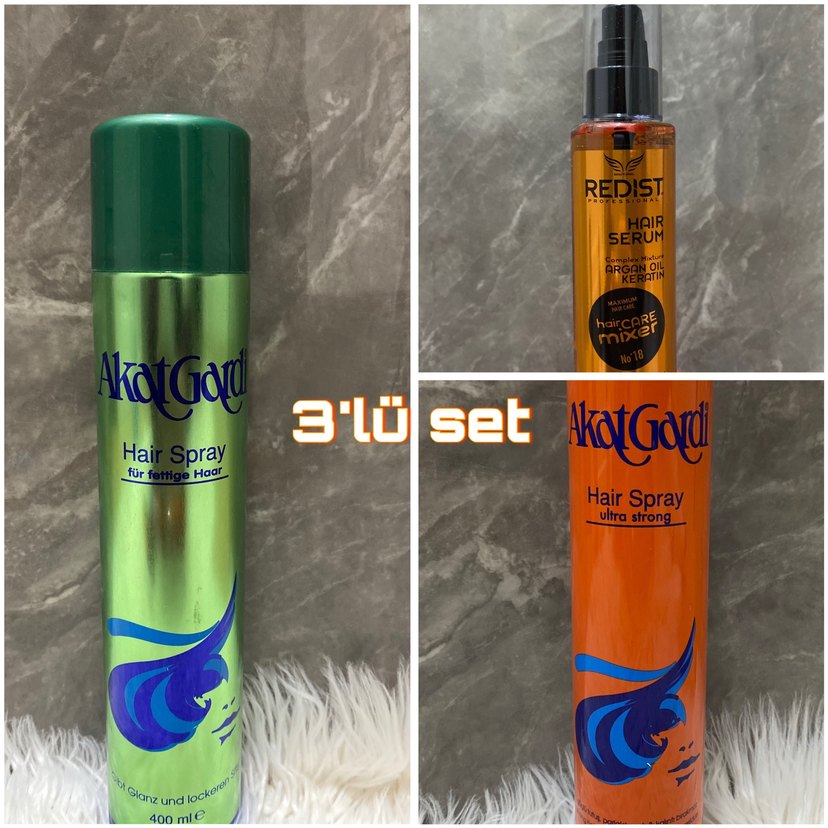 Yeşil parlaklık veren saç spreyi, AkatGard turuncu ultra güçlü saç spreyi ve argan yağı ile keratin içeren Redist saç serumu içeren 3'lü set.