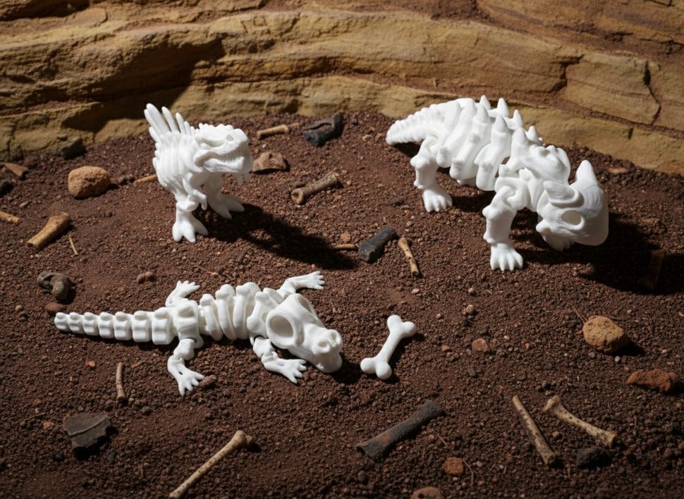 Detaylı kemik yapısına sahip beyaz dinozor iskeleti aksiyon figürleri, tarih öncesi bir sahne oluşturur.