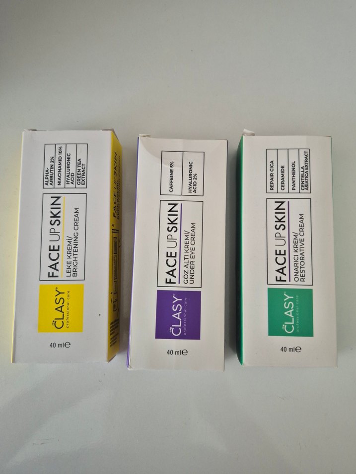 3 lü Set Clasy yüz bakım kremleri seti, leke ve aydınlatıcı, göz altı ve onarıcı krem içerir, her biri 40ml.
