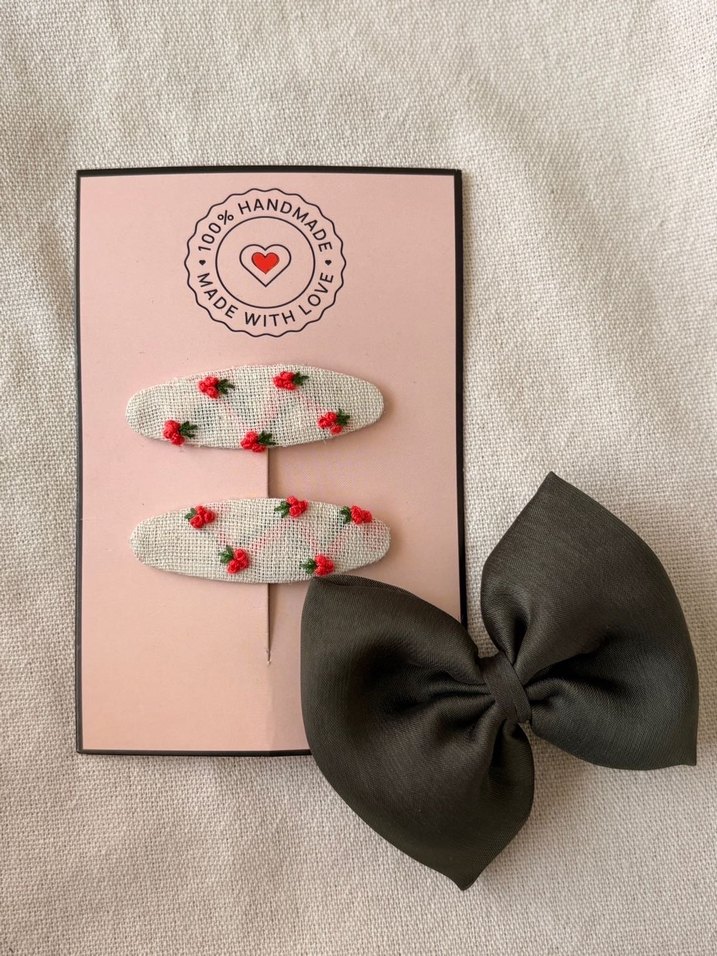 Kırmızı çiçek nakışlı gri bebek tokalar ve uyumlu gri fiyonk, el yapımı ve bohem tarzda. ✨