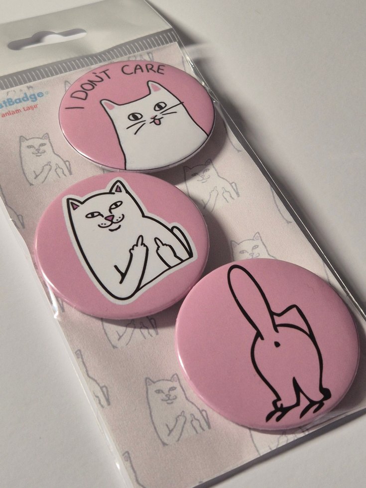 Pembe pastel renkte, üzerinde esprili kedi çizimleri bulunan üçlü, iğneli, metal rozet seti. Çap: 4.4 cm. Sıfır paketinde gönderilecektir. ✅