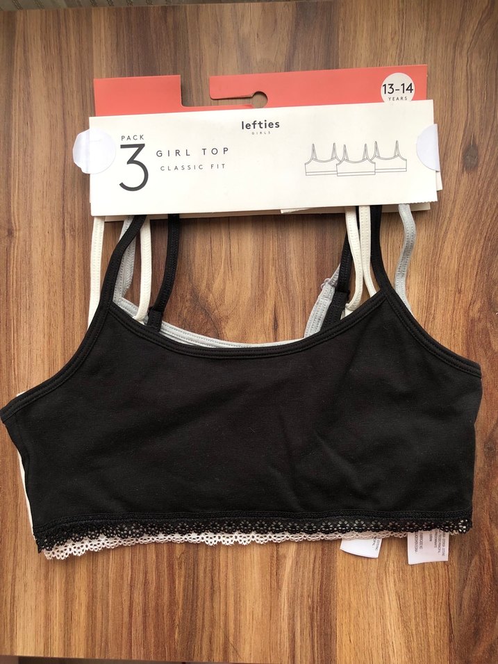 13-14 yaş kızlar için klasik kesim, siyah mini spor sütyeni seti. Yumuşak kumaş ve ince dantel detay içerir.