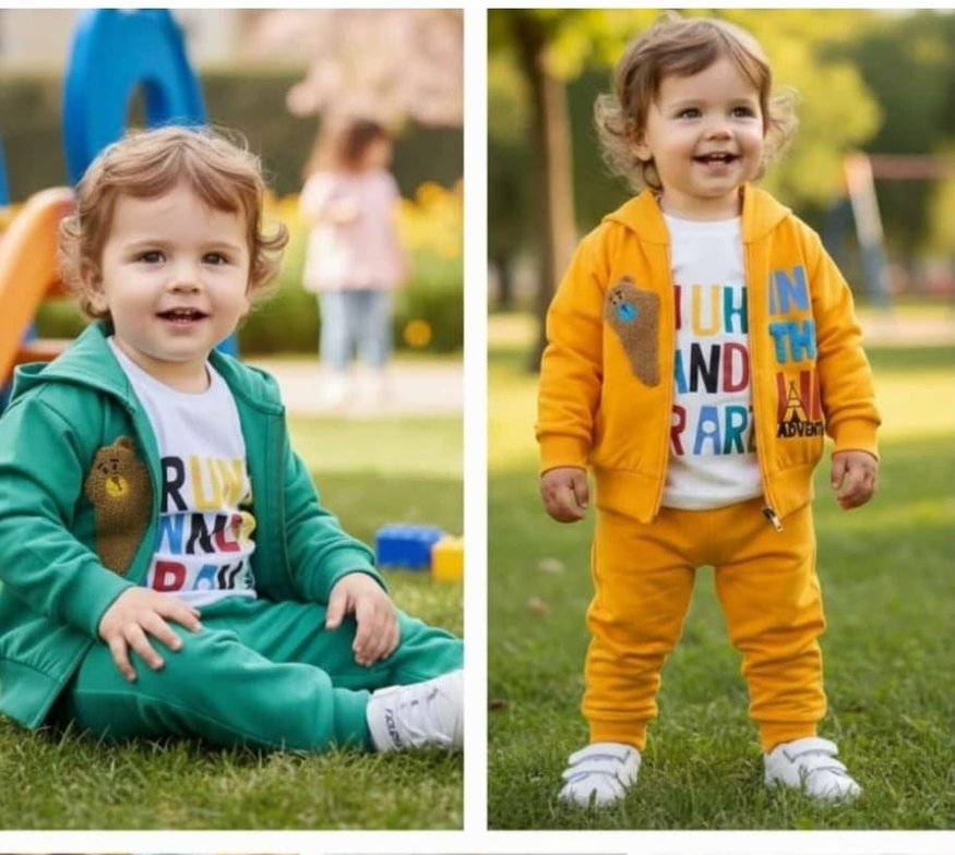 Rahat kesimli, kapüşonlu ve renkli baskılı detaylara sahip sarı erkek çocuk eşofman takımı. Yumuşak ve sıcak kumaştan üretilmiştir.