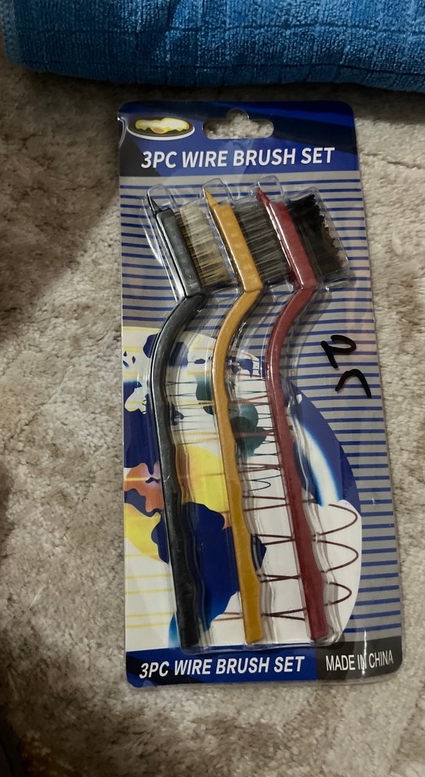 Üç farklı renkte eğimli saplı, sert kıllı tel fırça seti. Temizlik veya makyajda kullanılabilir. Çin malı.