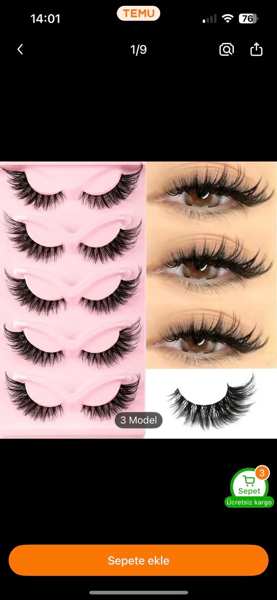 Pastel pembe tepside 3 farklı model takma kirpik bulunmaktadır. Kirpikler uzun ve hacimlidir, gözleri doğal şekilde vurgular.