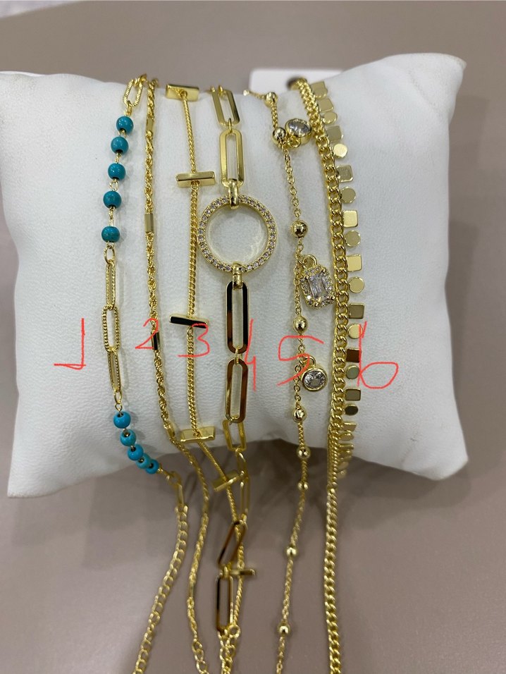 Zincir detaylı, altın renkli bohem bileklikler, hafif nakış ve turkuaz boncuklarla sade ve retro tarzda günlük kullanıma uygun.