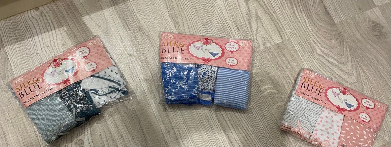 Yumuşak ve rahat kumaştan, açık mavi mini boy bohem desenli üçlü kadın iç çamaşırı seti.