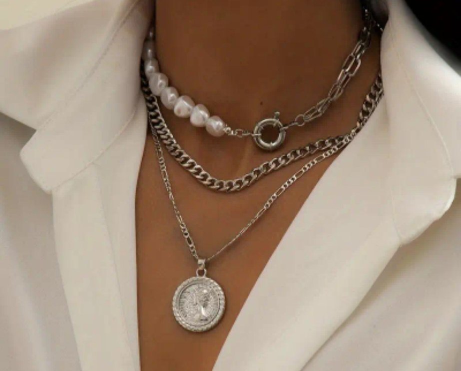 Bu kadın kolye, detaylı zincirler ve vintage bohem tarzı ile dikkat çeker. Gri tonlar ve yılan deseni içerir, günlük kullanıma uygundur. Midi uzunluktadır, retro ve hippie havası taşır.