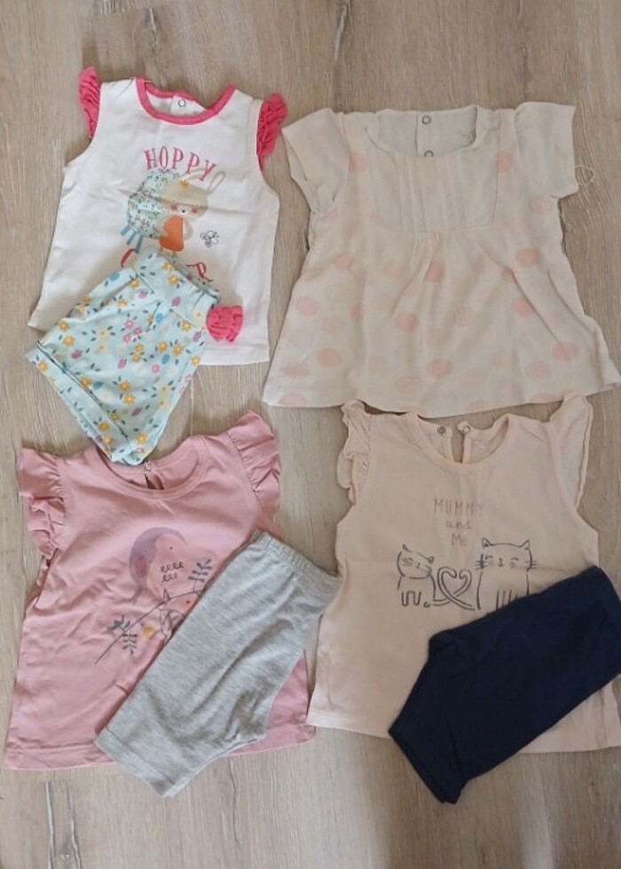 Lacivert alt li takımda hafif leke mevcut. Pembe şortlu takımın üstte hafif sararma.