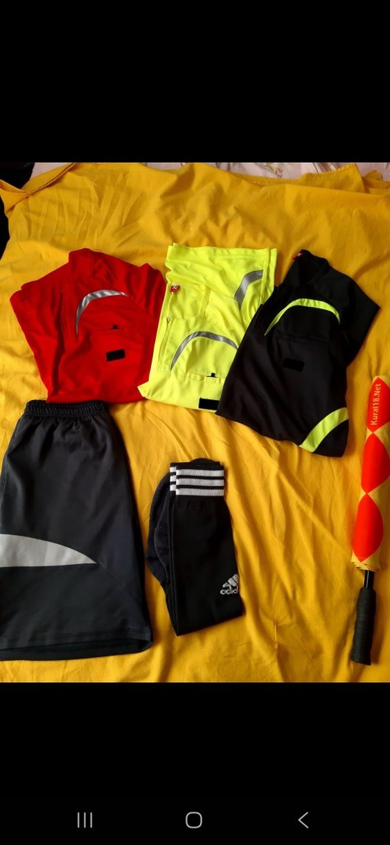 Fitted kesim, yuvarlak yakalı, sentetik kumaştan yapılmış parlak sarı kirmizi fume renkli erkek hakem forma seti hiç kullanılmadi alan kişiye zaten farkeder hiç kullanılmadığını kural 18 sitesinden 3.ooo tl ye almıştık kullanmak nasip olmadi 3 adet forma 1 çorap 1 sort ve 1 bayrak alan kişi hayırlı olsun allah hakem şansı versin
