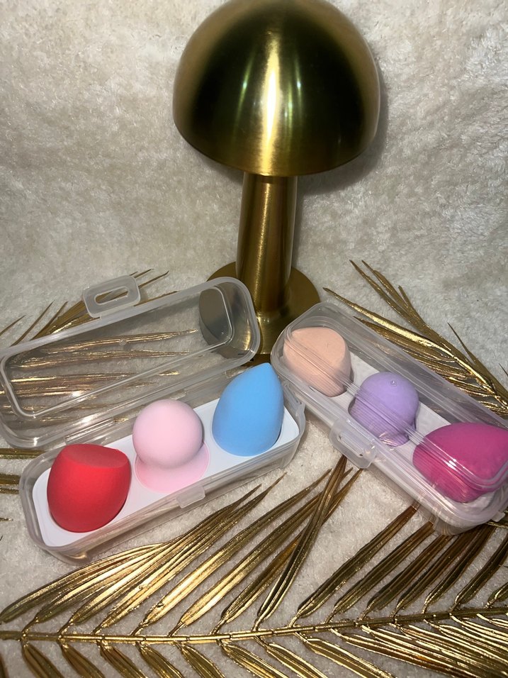 Açık tonlarda 3 renkli makyaj süngerleri seti, pürüzsüz uygulama için. Koruyucu plastik kutu ile birlikte.