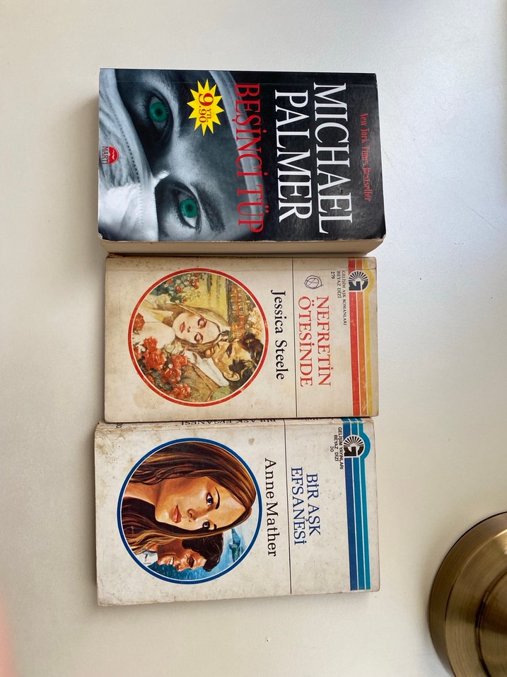 Michael Palmer, Jessica Stecle ve Anne Mather'ın romanlarından oluşan üç kitaplık set. "Beşinci Tüp," "Nefretin Ötesinde" ve "Bir Aşk Efsanesi" adlı eserler bulunur. Kitaplar cep boydur. Kitaplar birbirinden bağımsızdır. Ayrı ayrı alabilirsiniz Kitaplar temizdir ve hasarsızdır. Ayrı ayrı almak isterseniz fiyatı sorabilirsiniz. Aşk romanlarının basım yılı eskidir. Görselde belirttim. 3 kitabın fiyatı 70 tldir.