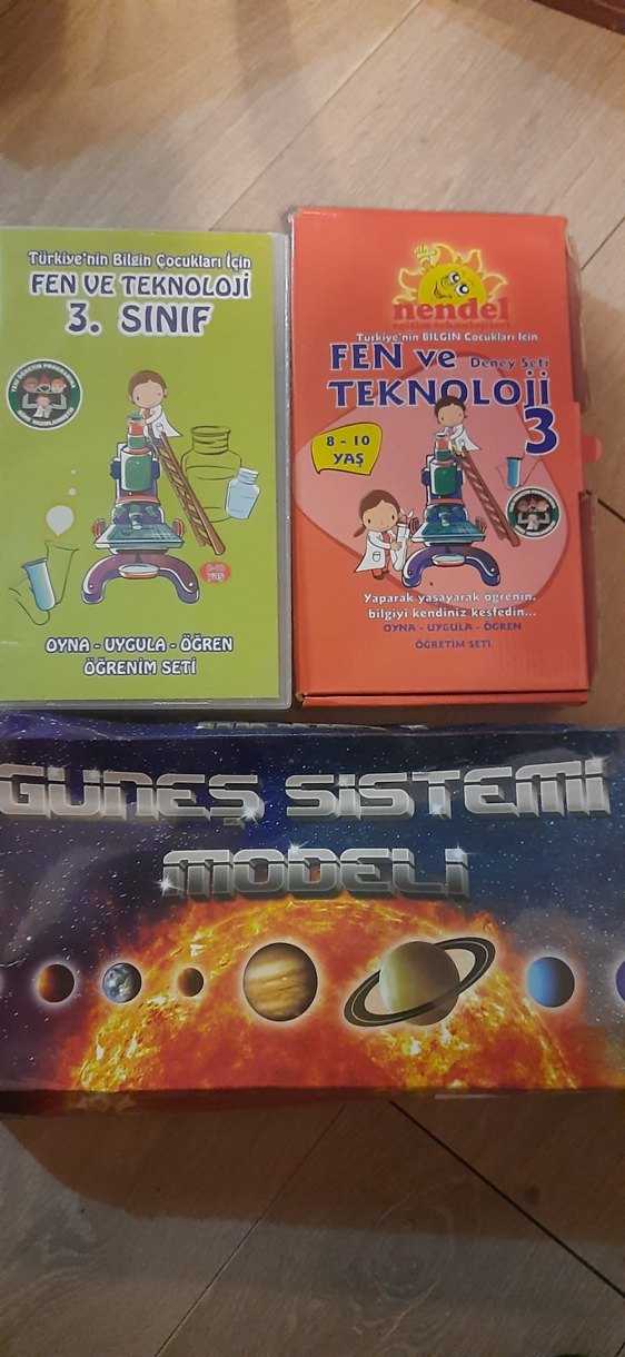 8-10 yaş çocuklar için 2 adet 3. sınıf fen ve teknoloji öğrenim seti, oynayarak ve uygulayarak keşfetmeye yönelik kitaplar ve güneş sistemi modeli içerir.