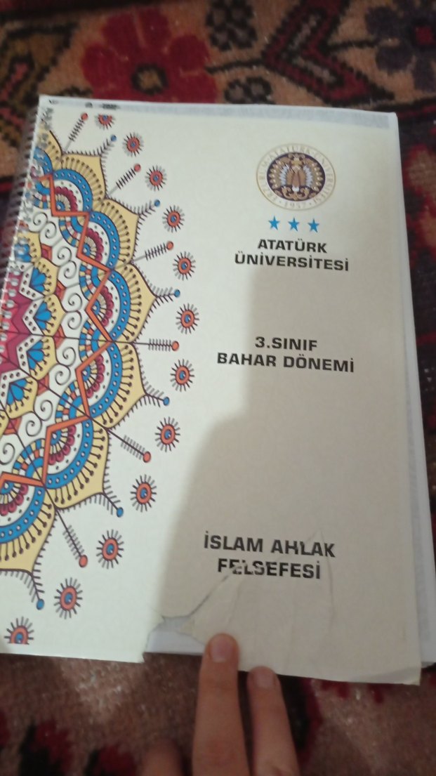 Atatürk Üniversitesi 3. sınıf bahar dönemi için İslam ahlak felsefesi konulu kitap. Kapakta geleneksel desenler bulunur. İslam ahlakının içi sıfır dışında küçük bir yırtık var İslam tarihi içi notlu ve çizili