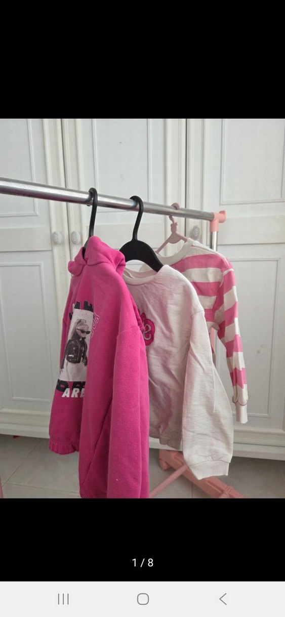Çocuklar için pastel pembe ve beyaz üstler, kapüşonlu ve uzun kollu modeller, askıda. Yumuşak ve rahat tarzlar. pembe kapşonlu olan oversizedir, baskısında çatlama vardır. beyaz barbienin likrası az. pembe çizgili olan şardonludur.
