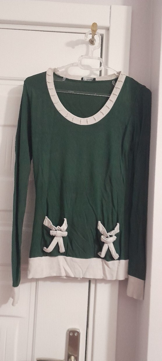 Fitted kesim, uzun kollu, yuvarlak yakalı, yeşil beyaz mavi triko kumaştan, 3 tane bluz