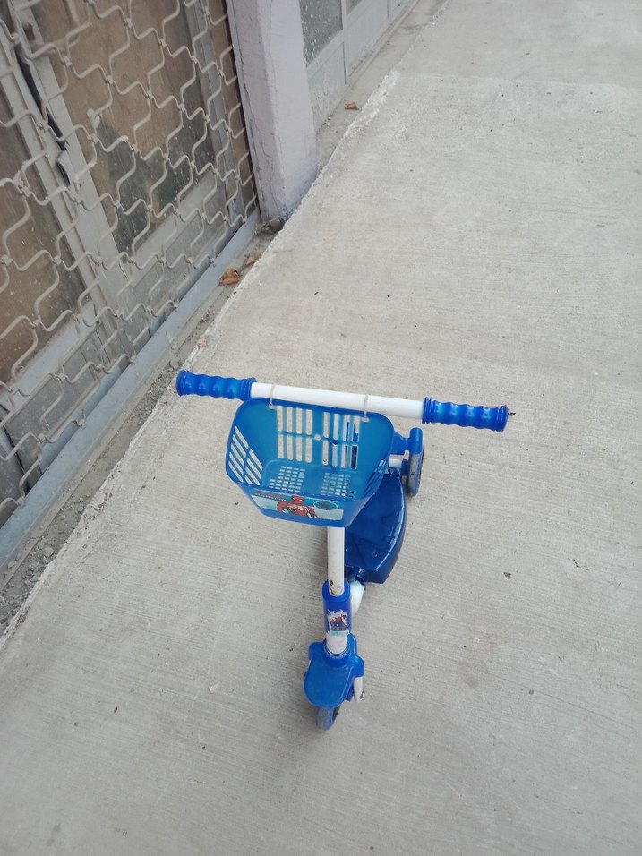Mavi renkte, üç tekerlekli ve manuel 3 kademeli ayarlanabilir çocuk scooterı. Sepetli ve örümcek desenlidir.