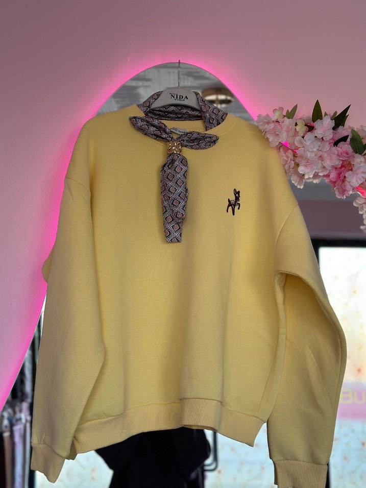 Gevşek kesim, yuvarlak yaka ve uzun kollu sarı sweatshirt. Yumuşak örgü kumaştan yapılmış, nakış detaylı ve pastel tonlarda günlük sokak stili için uygun.