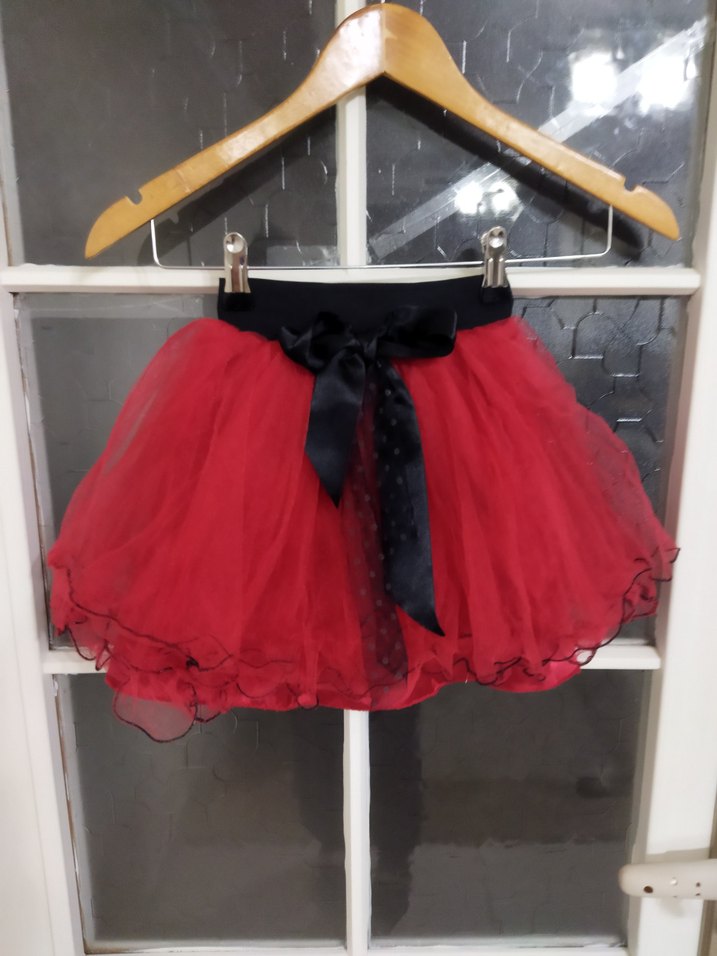 3 yaş kırmızı tü tü etek Altı kalın saten astarlı üstü 3 kat tül önden siyah fiyonklu beli lastikli istenilen ölçüye göre acila bilir az kullanılmış resimde görüldüğü gibi sadece 7 resimde görüldüğü gibi arka tarafında etek ucundaki siyah iplik sökülmüş giyince pek belli olmuyor başka bir sorunu yok boy uzunluğu 37 cm ihtiyaç fazlası Kız çocuklar için fit kesim, kırmızı renkli fırfırlı gotik stil etek. Siyah fiyonk detaylı, yumuşak sentetik kumaştan yapılmıştır.