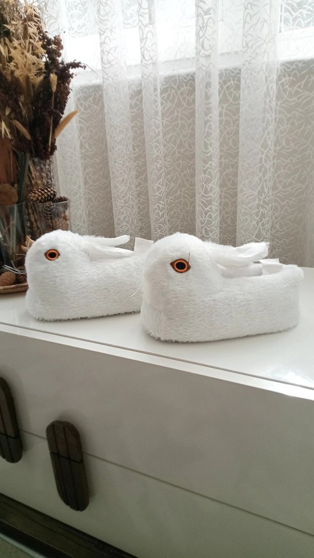 Yumuşak peluş dokulu, işleme detaylı beyaz tavşan şeklinde ev terliği, rahat ev kullanımı için uygundur.