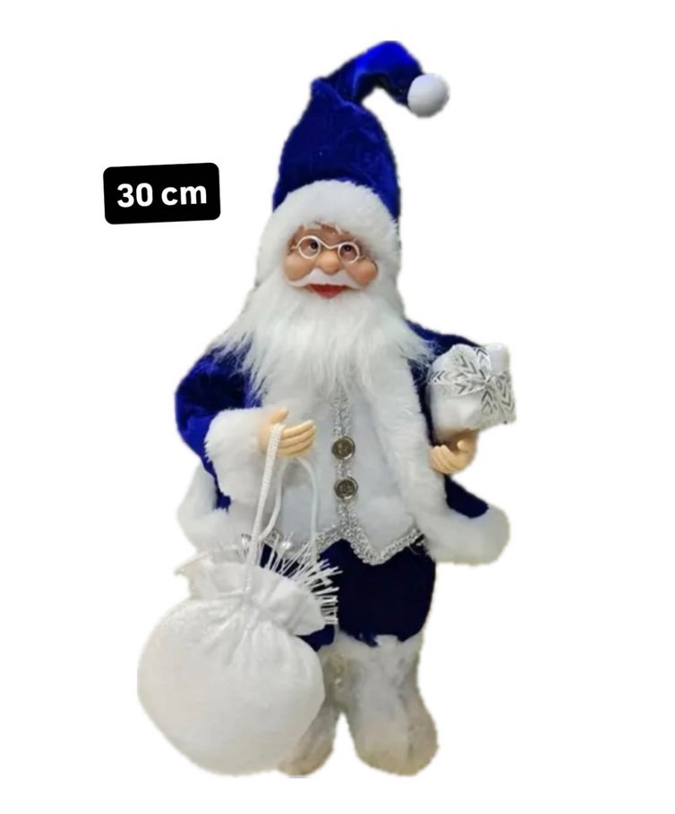 30 cm yüksekliğinde, mavi ve beyaz kürklü renkli Noel Baba figürü. Üzerinde hediye ve çanta tutuyor.