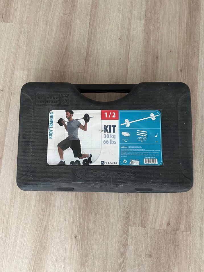 30 kg (66 lbs) ağırlık seti için siyah taşıma kutusu, üzerinde kullanma talimatları bulunan baskılı etiket ile. Düzenli saklama ve taşıma için uygundur. ️♂️