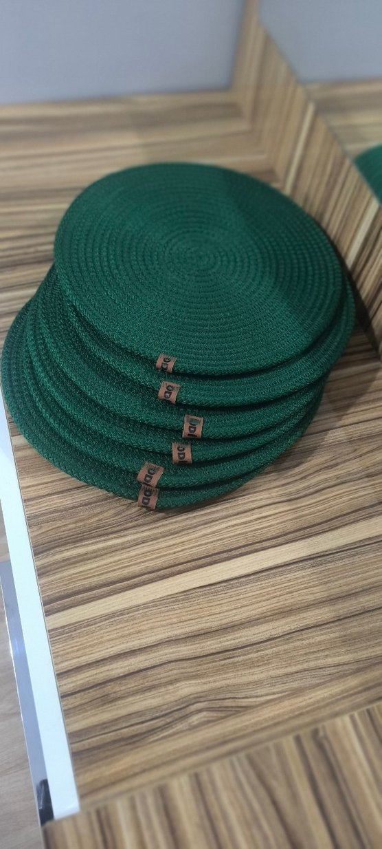 Koyu yeşil renkte, dokuma malzemeden yapılmış bohem tarzda yuvarlak amerikan servisler, masanıza doğal bir dokunuş katar. ️