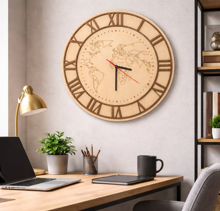 30x30 cm Ahşap Dünya Haritalı Dekoratif Duvar Saati Sessiz