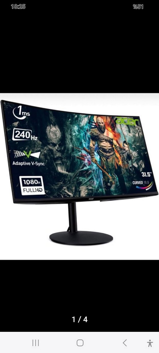 31.5 inç kavisli monitör, Full HD 1080p çözünürlük, 240Hz yenileme hızı, 1ms tepki süresi ve Adaptive V-Sync özelliği sunar. 16:9 en boy oranına sahiptir. ️