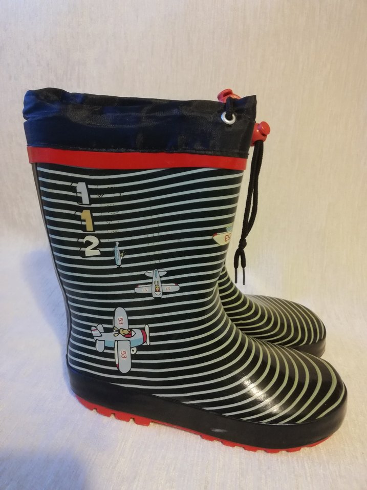 Kırmızı tabanlı, üzeri lacivert gri çizgili ve helikopter resimleri olan yağmur çizmesi. 31 numaradır. Plastik malzemeden üretilmiştir. Az kullanılmıştır. Temiz ve çok iyi durumdadır.