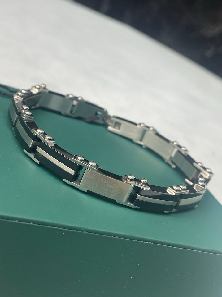 Erkek bileklik, siyah ve gri tonlarda metal detaylarla modern ve iş tarzına uygun cesur bir tasarıma sahiptir. En:7mm Sıfır etiketli üründür.Kararma , paslanma ve oksitlenme yapmaz.✨