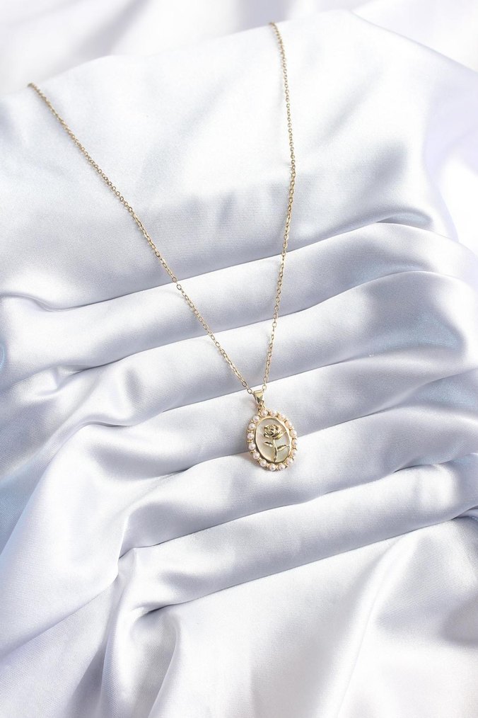 316L Çelik Gold Renk Gül Model İnci Detay Kadın Kolye