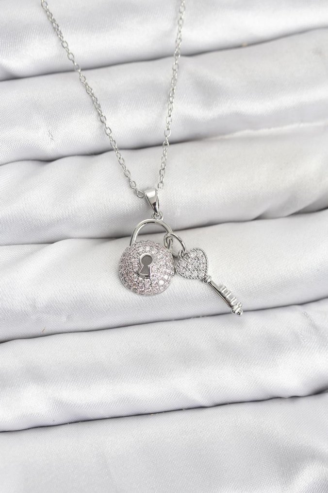 316L Çelik Zincir Gümüş Kilit Anahtar Model Zirkon Taşlı Kolye