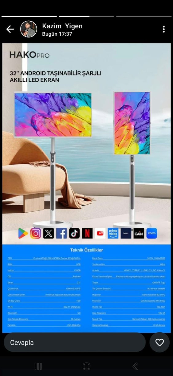 32 inç taşınabilir, şarjlı Android akıllı LED ekran. Çoklu uygulama desteği ve çeşitli görüntüleme seçenekleri sunar.