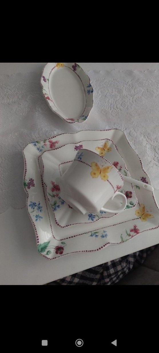 Çiçek ve kelebek desenli, beyaz porselen yemek takımı. Kupa, tabak ve küçük tabak içerir. Hafif renklerle süslenmiştir. bir kere kullanıldı yerim olmadığı için satıyorum çok şık