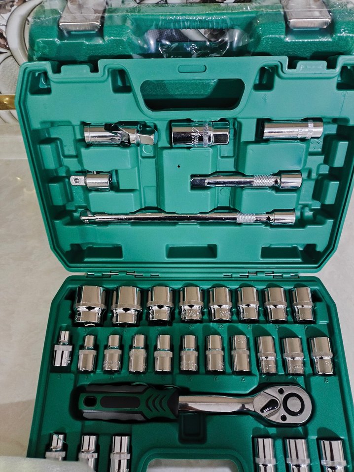 Çeşitli mekanik işler için krom kaplama lokma anahtarlar ve kılavuz anahtardan oluşan yeşil renkli takım çantası. ️