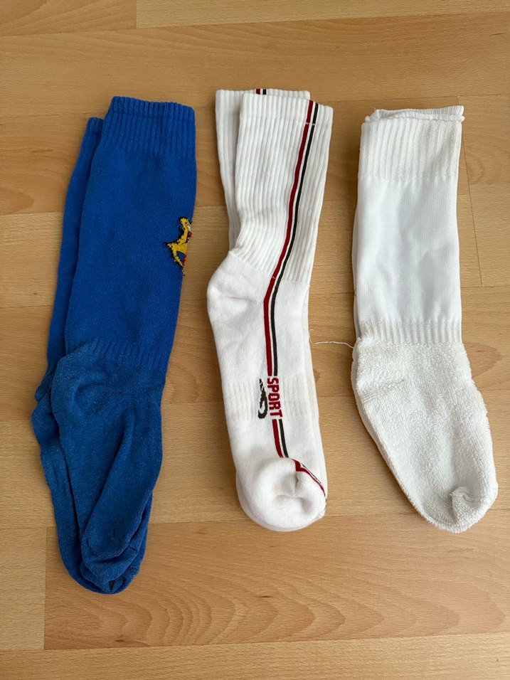 Beyaz ve mavi renklerde, düz ve çizgili desenli, yumuşak dokulu erkek çorapları seti. Temiz ve sorunsuz