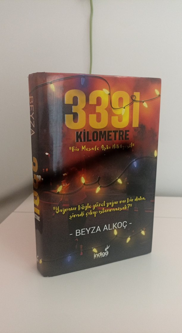 Beyza Alkoç'un 3391 Kilometre romanı, aşk ve mesafe temalarını işler. Kapakta sıcak ışıklar ve şiirsel bir alıntı yer alır.