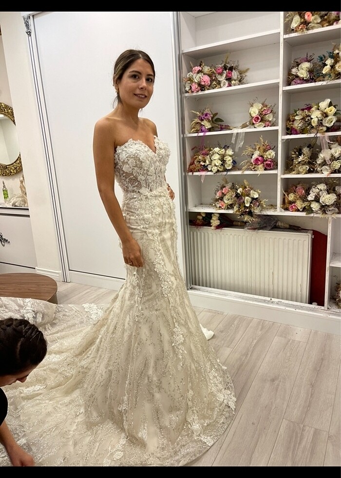 Tasarım diktirdim isteyene özelden başka resimler atabilirim üç boyutlu kumaş uzun duvağı ile gönderilecektir sırtı transparan uzun kuyruklu ibandan gönderim yapılır 1.60 boy 17 cm topuklu ile giyildi