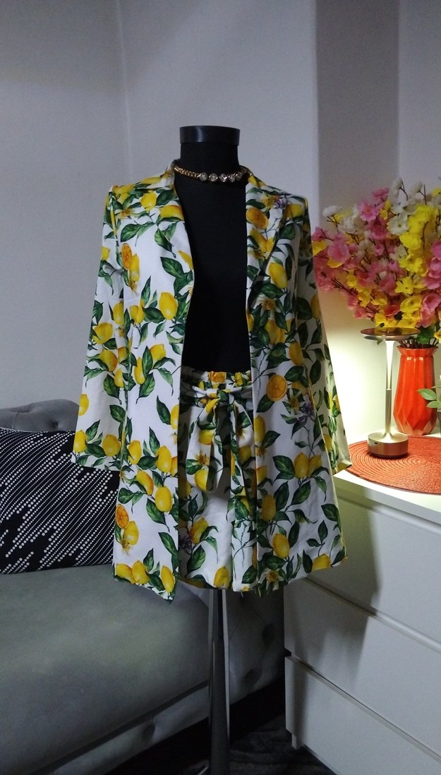 34/XS beden,ceket boy 75 cm, şort boyu 35 cm, 1 defa giyildi, sıfır ayarındadır, Sarı desenli, kısa kesim, regular fit kadın ikili ceket takımı