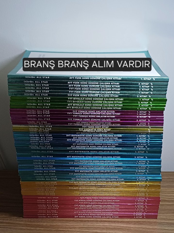 En az bir branşın tyt veya ayt kitapları olacak şekilde verebilirim. Örneğin Tyt kimya konu anlatım ve soru bankası/Ayt Matematik konu anlatım ve soru bankaları şeklinde. Kitaplarla alakalı bilgileri görsellerde branş branş yazdım. 0-5 kitap için tane fiyatı 70tl, 5-10 kitap için tane fiyatı 65tl, 10 ve daha fazlası kitap için tane fiyatı 60tldir. Görsellere göre mevcut olmayan kitaplar: Ayt Matematik konu anlatım ve soru bankaları.