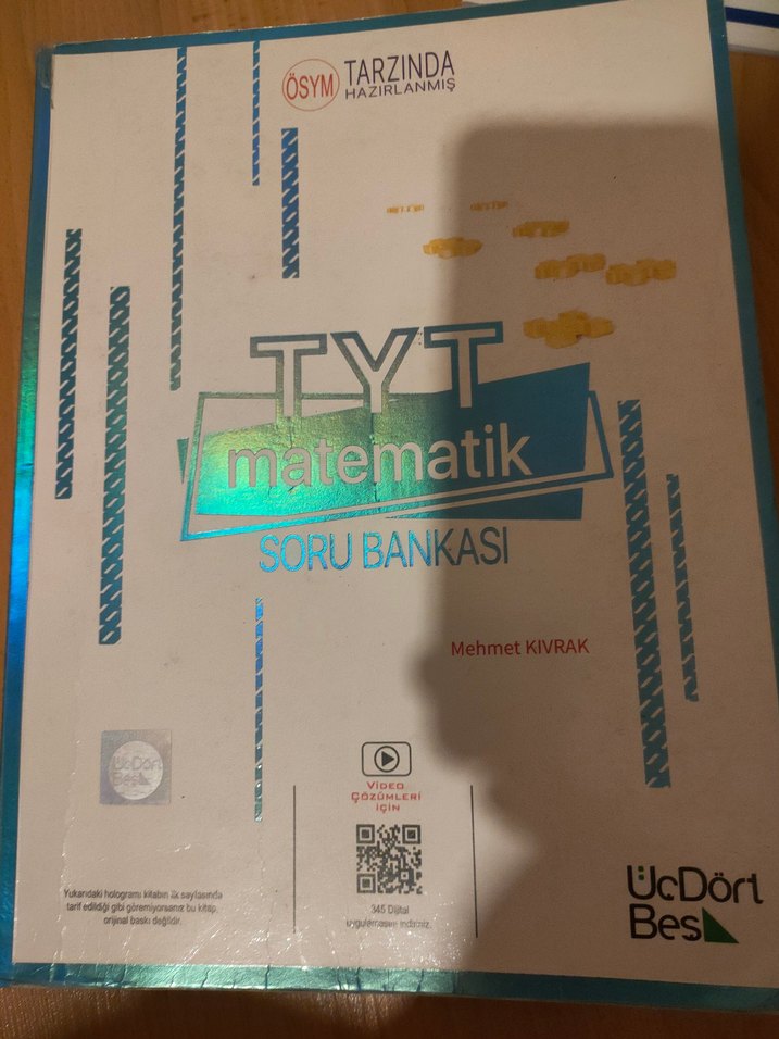 345 TYT matematik soru bankası, ÖSYM tarzında sorular içerir ve QR kod ile video çözümleri sunar. İkinci görselde üstü çizili yerler dışında tamamı boştur. Tekliflere açığım.
