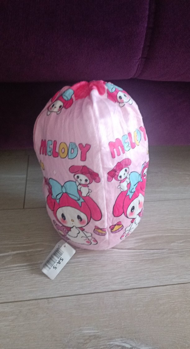 Pastel pembe renkte, Melody karakteri ve renkli yazılarla süslenmiş, yumuşak kumaştan yapılmış peluş oyuncak.