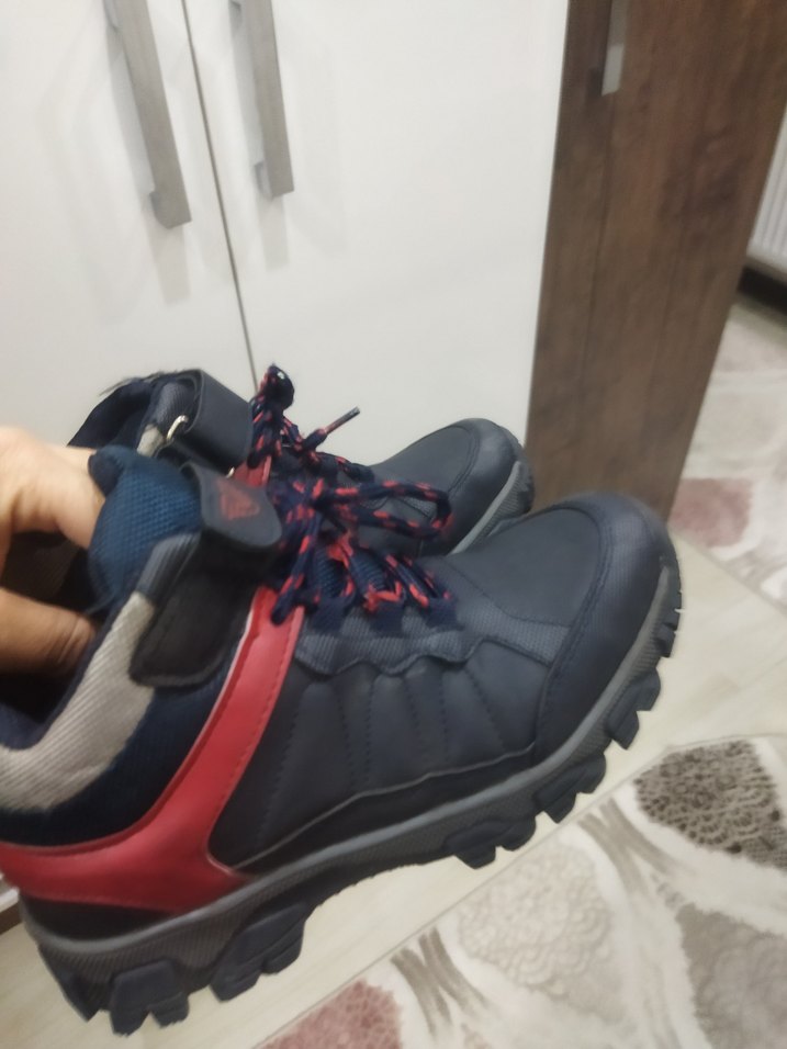 Koyu mavi renkli, baskılı desenli ve cırt cırtlı bağcık sistemi ile rahat erkek outdoor spor ayakkabısı. kenarında bır yıpranması var cırt cırt kısmı konpile kopartilip kulanilabilir