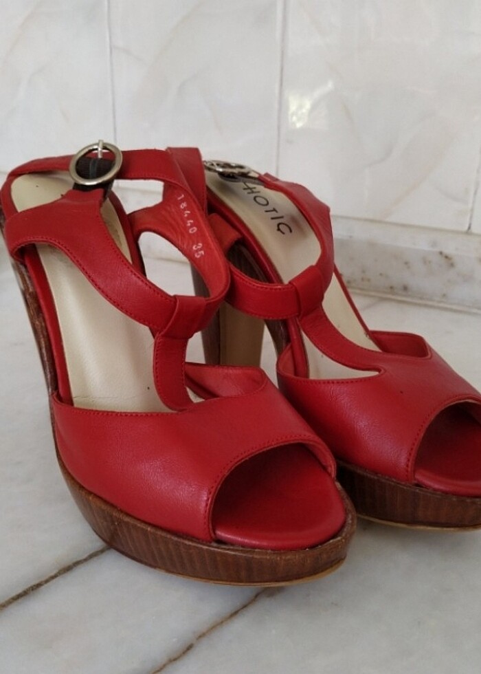 Hiç kullanılmadı sadece içerde denedim. Sifi ürün tertemiz gerçek deri önden platformlu çok hoş ve canlı bir rengi var 3cm platformu var topuk 12 cm topuk taba kendisi kırmızı gerçek deri orjinal hotic