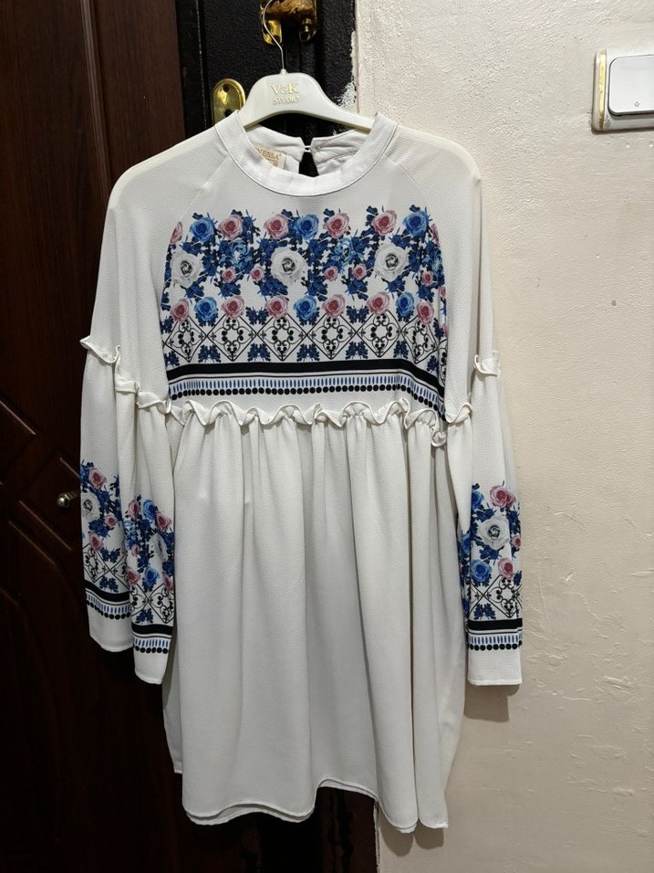 Uzun kollu, yuvarlak yakalı beyaz bohem tunik. Nakışlı çiçek desenleri ve fırfır detaylarıyla bol kesim, yumuşak dokulu kumaştan üretilmiştir. Teklife açık.