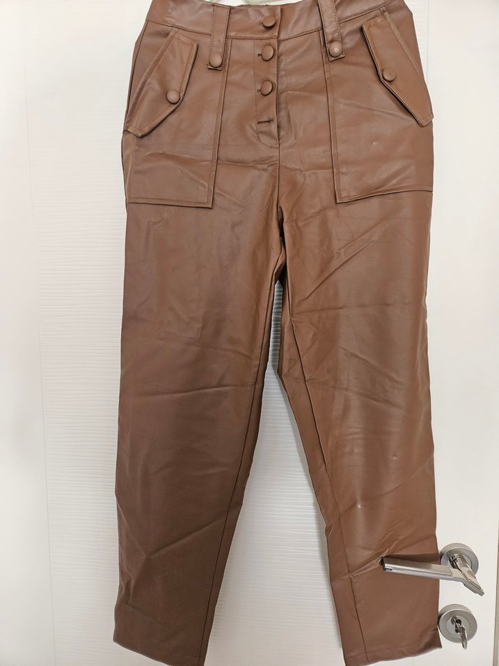 Düğmeli ve ön cepleri olan bol kesim kahverengi deri pantolon. Midi boy, parlak görünümlü, sokak stili ve günlük kullanım için uygun. Gorseldeki gibi 2 yerde deforme mevcuttur